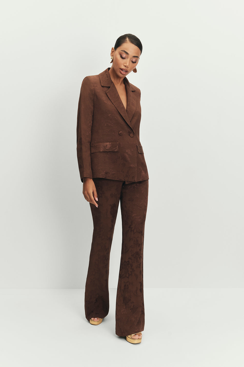 Atrévete a destacar con nuestro pantalón Flare Chelsea Marrón, confeccionado en un sofisticado jacquard de viscosa que aporta textura y elegancia. Su tiro alto estiliza tu figura y realza la cintura, mientras que la silueta flare acampanada en el final alarga visualmente tus piernas con un movimiento fluido y moderno.